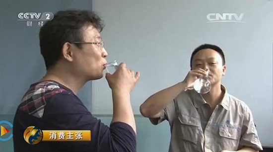 成都市自来水有限责任公司水七厂的宋厂长(右)和记者直饮出厂水