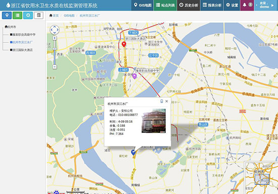 如此之高的达标率,水质监测起到怎样的作用?在过去的两年期间,安恒集团受合肥市环保局委托,在董铺水库和大房郢水库各建设1个固定水质自动监测站和2个浮标监测站,并建设运行了安徽省*个饮用水源水质监测预警系统——WaterViewTM-WQA云端水质应用系统,分别对水质五参数(温度、pH、溶氧、电导、浊度)、气象参数、高锰酸盐指数、氨氮、总磷总氮、生物毒性等污染物因子进行实时准确监测,这些数据通过WaterViewTM-WQA云端水质应用系统分析处理,以列表、GIS地图等多种形式展现,帮助合肥市环保局全面掌握各个站点的水质信息;当水质出现异常波动,系统会以邮件、短信等方式第*时间向环保局发出报警,可以**地知道水质超标数值、超标时间等信息;系统还能根据水质的变化趋势和大数据模型的分析,在污染事故发生之前向环保局报告潜在危机,提示相关人员及时处理,起到事前预警的作用,实现24小时全天候自动监测和预警,保证水源地水质安全。